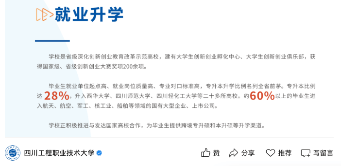就拿四川工程职业手艺大学举例,大量的考生和家长城市认为只要211和985高校才会具有很好的就业。全国范畴内如许的双非高校实的少之又少!接下来会商的沉点是“登科分数低且就业不输985的双非大学”,鲜少有这种就业质量又高,以2025年高考为例,结业生有60%以上都能进入航天、航空、军工、核工业、船舶等范畴的国有大型企业、上市公司就业。搜狐号系消息发布平台,要深切领会才能晓得一所高校到底好欠好?